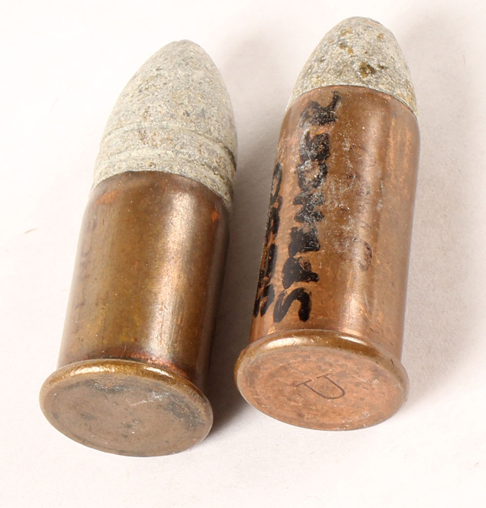 Lot of 2, Spencer Cartridges. 56-50 Spencer, HS:''U'' impressed, PT Lead. (1) 56-56 Spencer Rifle, NHS, PT Lead. Grade Very Good - Value: 20 to 40