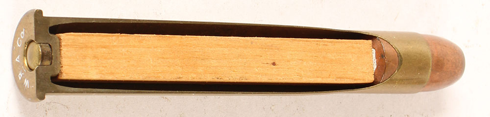 Scarce, .45-125 Winchester Express. Partial HS:''W.R.A.Co.'', Factory Cut-Away by Winchester with wood rod in case., FN CJ FMJ. Grade: Excellent - Value: 100 to 200