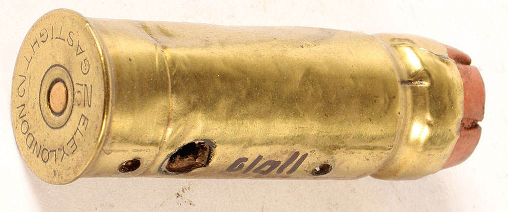 12 Gauge Paradox, HS:''ELEY LONDON 12 GASTIGHT No'', FN Lead Hollowpoint. Three non-factory holes in case. Grade: Excellent - Value: 20 to 40
