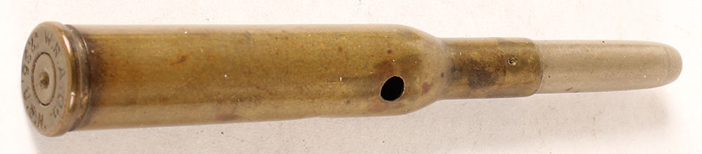 .236 USN Rimmed, Dummy rd, struck pri., and a hole drilled through case, has four stake marks to hold bullet in place. Grade: Very Good + - Value: 26 to 50