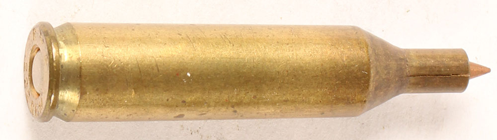14 cal with a 2.9 Ogive bullet, H.S: RP 222 Rem, cracked neck with projectile pushed into case. Grade: Good - Value: 10 to 30