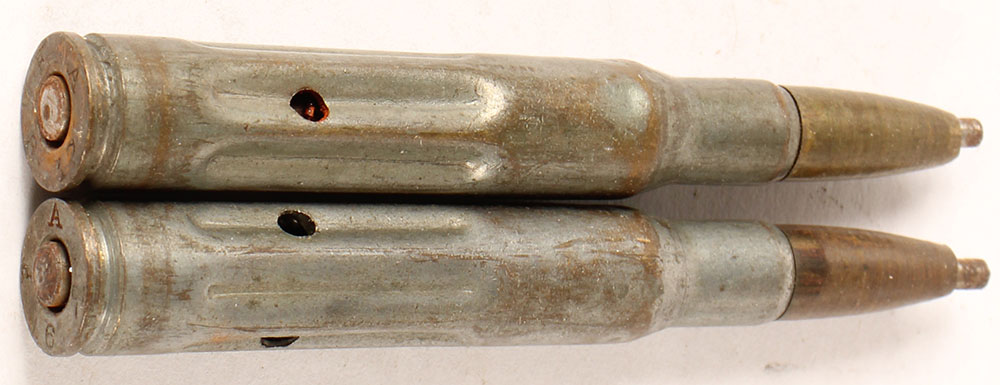 Lot of 2, .30-06 Sprg Hollifield Dotter cartridges. Both with tinned case, flutes and three holes. Need Cleaning. Grade Good ++ - Value: 70 to 150