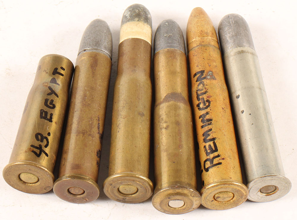 Lot of 6, Military Cartridges. One each of the following: 10.6 Russian Berdan. .433 Egyptian Remington Blank by UMC. 11mm Danish Remington (reload), 11mm Spanish Reformado. 11mm Werndl by Remington UMC. 45-70 Govt, Rifle, tinned from 1892. Grade Very Good - Value: 10 to 20