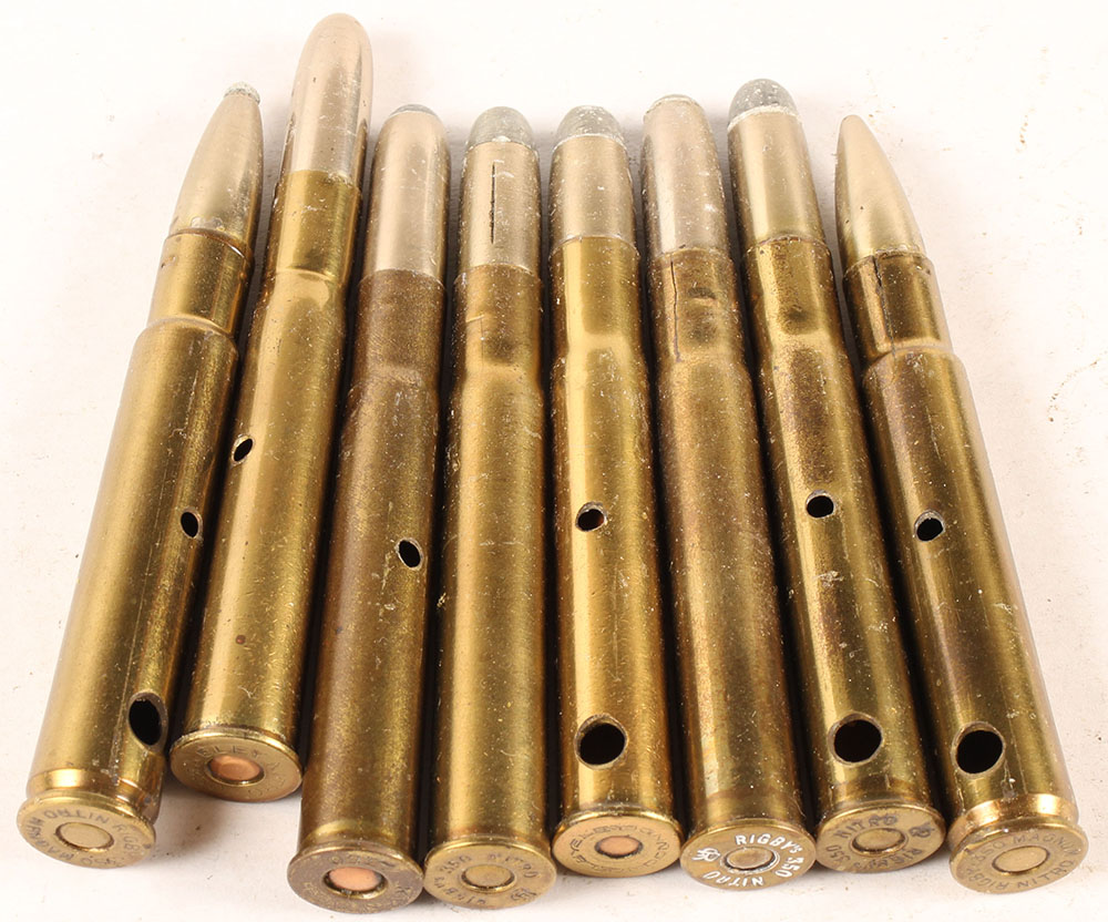 Lot of 8, British medium caliber cartridges. (6) .400-350 Rigby, 3--by George Roth, HS:''RIGBY'S 350 NITRO GR'', all sn. 2-- by Eley, sn and fmj. 1-- by Kynoch, HS:''KYNOCH 350'', sn. (2) .350 Rigby Magnum, 1--fmj and one sp. All have one or two non-factory holes in case. Grade Very Good - Value: 10 to 60