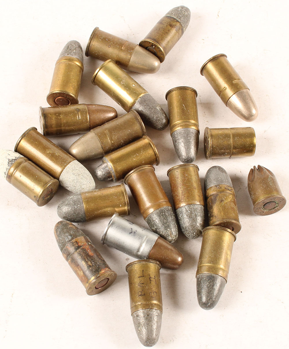 Lot of 21. British Revolver cartridges. (2) .455 Mk I Revolver, 1--R ^ L I'', PT Lead. 1--W.R.A.Co. 455 COLT'', RN Lead. (5) .455 Mk II Revolver .2--Military contract loads by Eley and Kynoch, 1--Military round by Royal Labs. 2--Commercial rounds by Kynoch, one of which is a dummy. (6) .455 Mk VI Revolver--from Kynoch, 1-- from Dominion Cartridge, 1--from Rocklea Australia, 1--From Kynoch DUMMY. (3) Other .455 cartridges, 1--Blank by Remington, Blank by Dominion, 1--Target load by Dominion. (5) .450 Revolver commercial, 2--by Kynoch, 1-- Eley, 1--REM-UMC, 1--George Eggerstroff, Grade Very Good - Value: 20 to 40