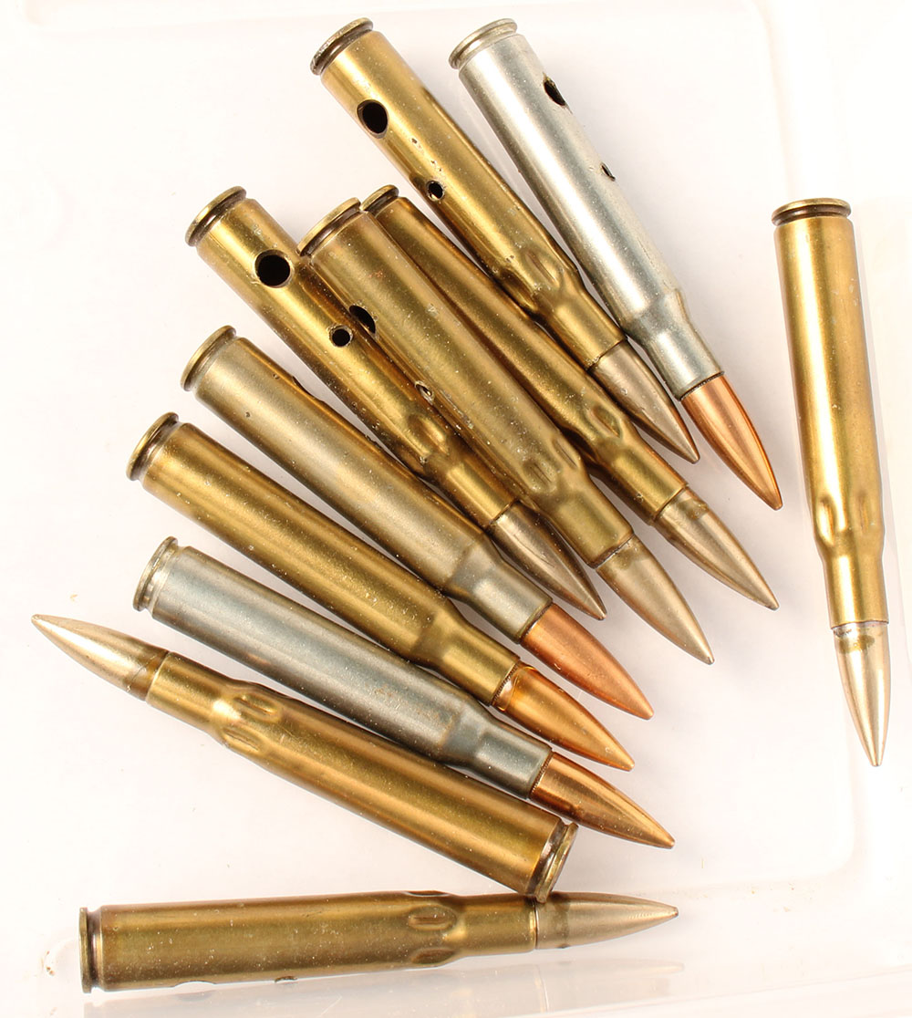 Lot of 11, .30-06 Sprg. Military Cartridges, all by Frankford Arsenal. (7) Guard Loads, short flutes near neck, Various dates ranging from 2-13 to 5-17 and another with just 17 for the year. (4) High Pressure Test rounds, 1--HS:''FA TEST'', Brass Case. 1--HS:''FA 42'', tinned case. 1--HS:''FA 4'', tinned case. 1--HS:''FA HP 50''. tinned case. All with two non-factory holes in case. Grade Very Good - Value: 10 to 40