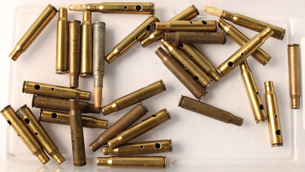 Lot of 31. .30-06 Springfield. All Blanks by Franford Arsenal. (28) M9 Blanks with various dates between 4-08 to 9-13. (2) 30-03 cases converted to .30-06, cream paper bullet. (1) .30-06 blank with tinned case and paper bullet. Most will have two non-factory holes in case. Grade Very Good - Value: 10 to 40