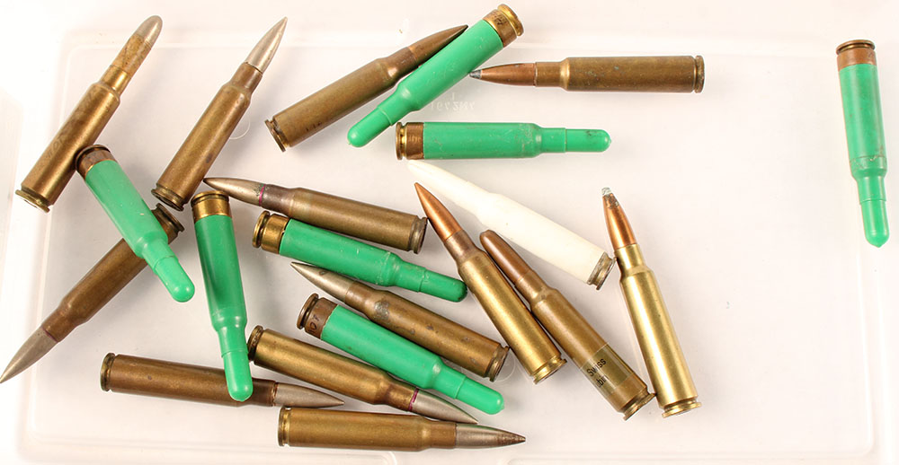 Lot of 21, European Military Cartridges. (11) 7.5mm Swiss, 7--Green plastic blanks, 3--sporting loads, 1--military load. (10) 7.5mm French MAS, (9) Ball Loads, 1 white plastic blank. Grade Very Good - Value: 10 to 30
