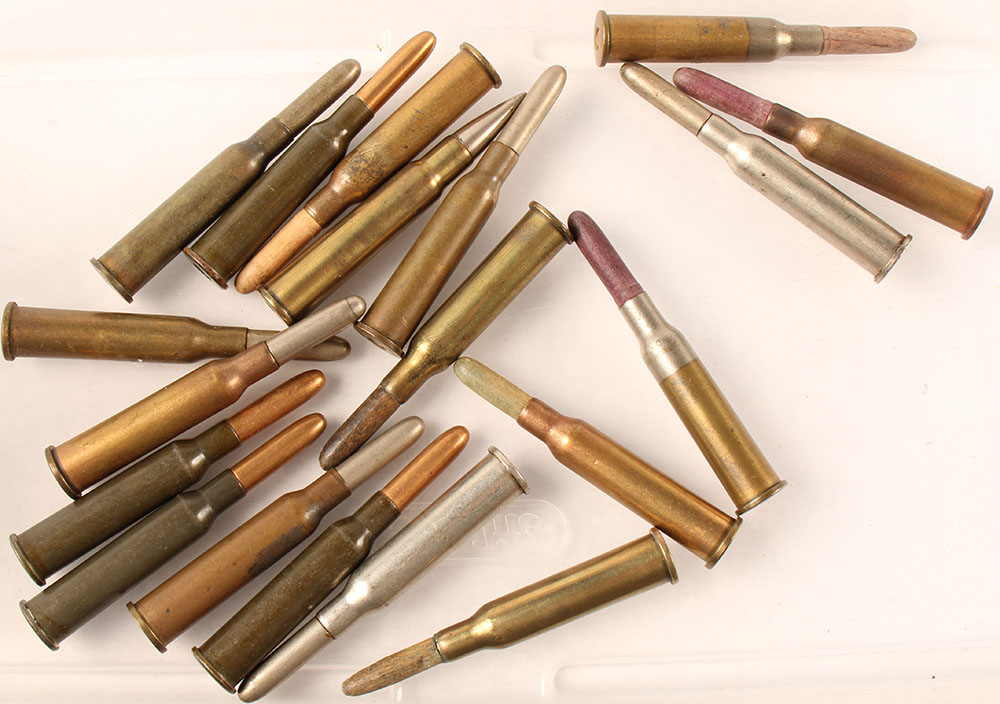 Lot of 19, Dutch military ammunition. (18) 6.5mm Mannlicher. 9--A mix of Dutch Army, Netherlands East Indies and German Occupation ball ammunition, 5---wood bulleted blanks, (2) guard loads, 2--dummies. (1) 8x57mmR Dutch MG. Grade Very Good - Value: 20 to 40