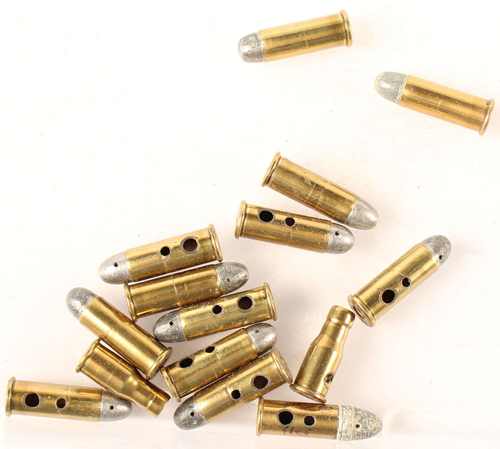 Lot of 15, .38 Long Colt. (1) HS:''U.S. ARMY'', RN Lead. (1) HS:''U.S. 38 COLT NAVY'', RN Lead. (2) .38 Colt Bottleneck Blanks, HS:''F A 1 08'', HS:''F A 8 05'', (11) .38 US Govt. Ball loads, HS:''F A 6 07, 9 12, , 11 05, 2 09, 8 07, 8 08, 8 05, 2 11, 9 06, 9 09, 5 11'', RN Lead. All have one or two holes in case. Grade Very Good - Value: 20 to 40