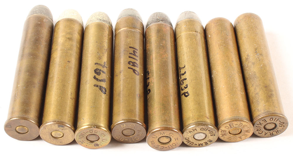 Lot of 8 50-110 Express, 2 WRACo shot gray & tan wads, 2 no H/S early WIN, 2 S UMC H with express bullets, 2 H.V. by Rem & UMC bullets are FNSN. Grade: Excellent - Value: 50 to 150