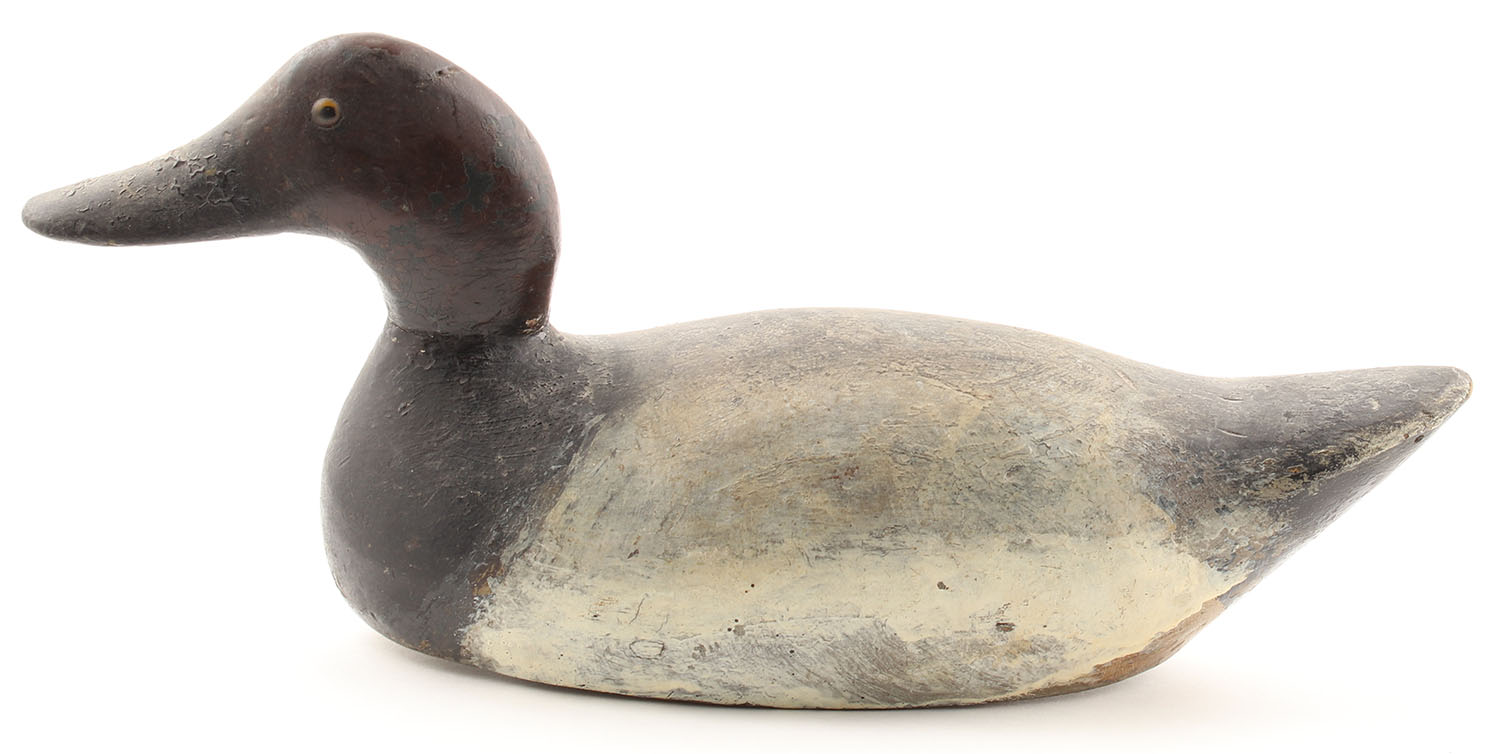 Canvasback Drake by Evans Decoy Co., Ladysmith, WI, glass eyes, hollow wood, repainted, name stamped on bottom, has weight & eyelet, 15'' OAL. Grade: Excellent - Value: 100 to 300