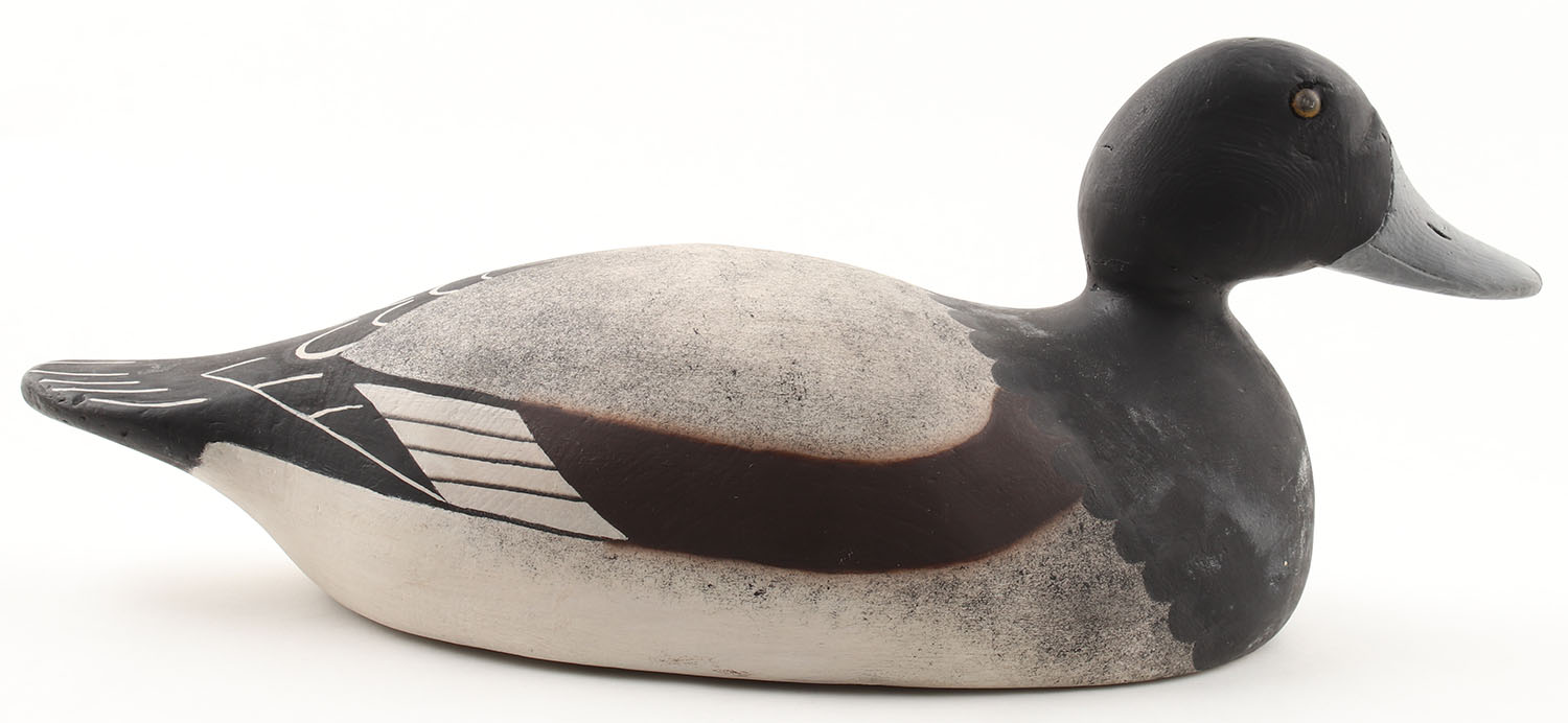 Bluebill Drake by Unknown Maker, glass eyes, solid wood, repaint?, structurally excellent, 18'' OAL. Grade: Excellent - Value: 50 to 100