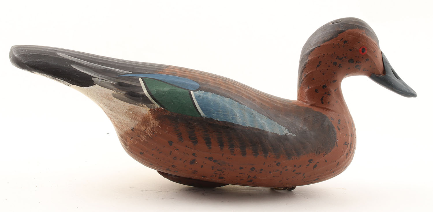 Cinnamon Teal Drake by Bryant, MD, painted eyes, hollow wood, original paint, structurally excellent, marked ''BRYANT'' on bottom, 13'' OAL. Grade: Excellent - Value: 50 to 100