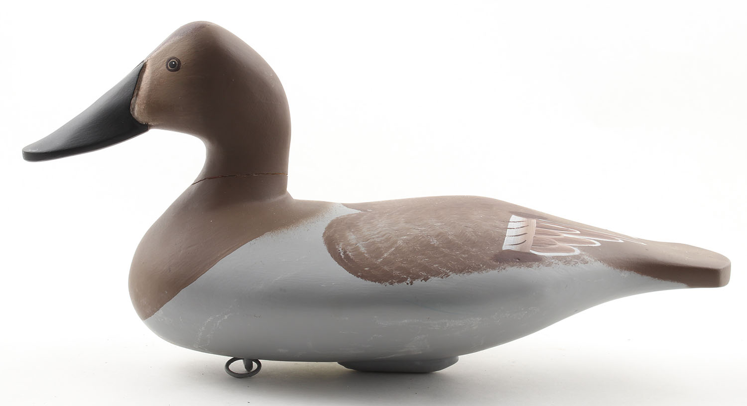 Canvasback Hen by Jeff Spencer, MD, painted eyes, solid wood, original paint, crack in neck, appears to be repaired with glued dowel, marked ''SPENCER'' on bottom, 16'' OAL. Grade: Excellent - Value: 40 to 80