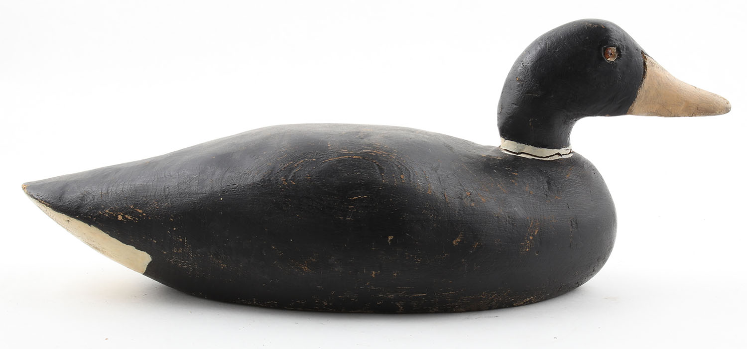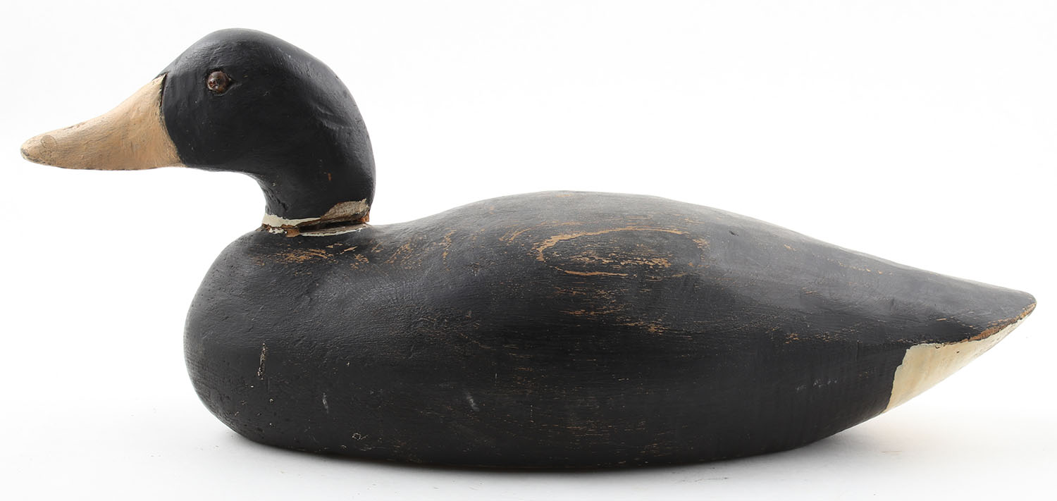 Coot by Unknown Maker, glass eyes (broken), solid wood, original paint, cracked neck, otherwise structurally sound, 16 1/2'' OAL. Grade: Good + - Value: 20 to 40