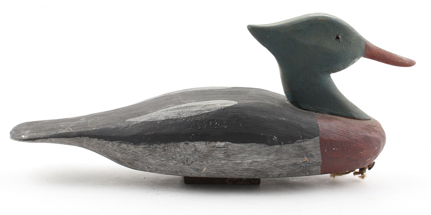 Red Breasted Merganser by Romie Waterfield, Crisfield, MD, glass eyes, solid wood, original paint, structurally excellent, 15 1/2'' OAL. Grade: Very Good - Value: 30 to 60