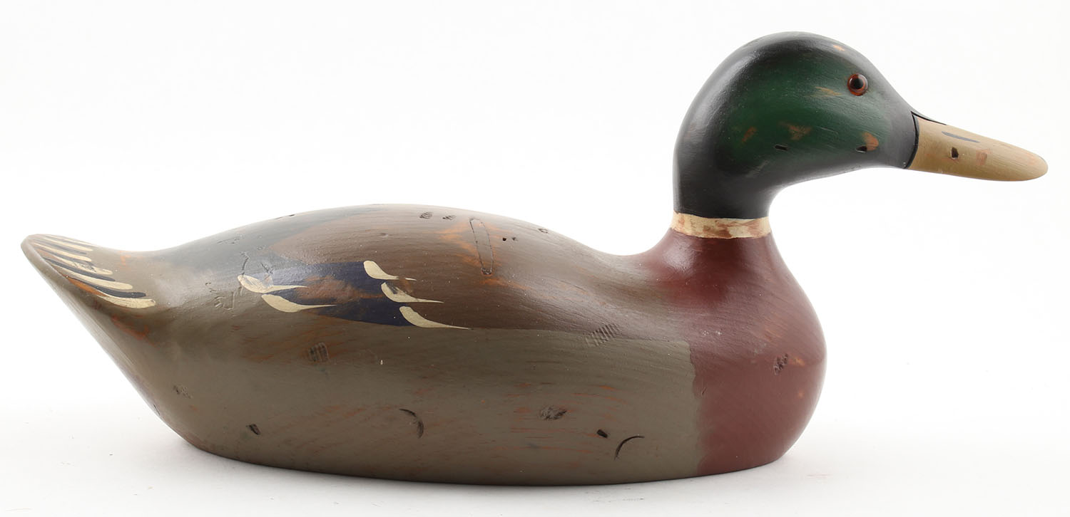 Mallard Drake by Leonard Hornick, 1984, Stoney Point Decoys, #18095, glass eyes, solid wood, original paint with intentional distress features, structurally excellent, 16'' OAL. Grade: Excellent - Value: 40 to 80
