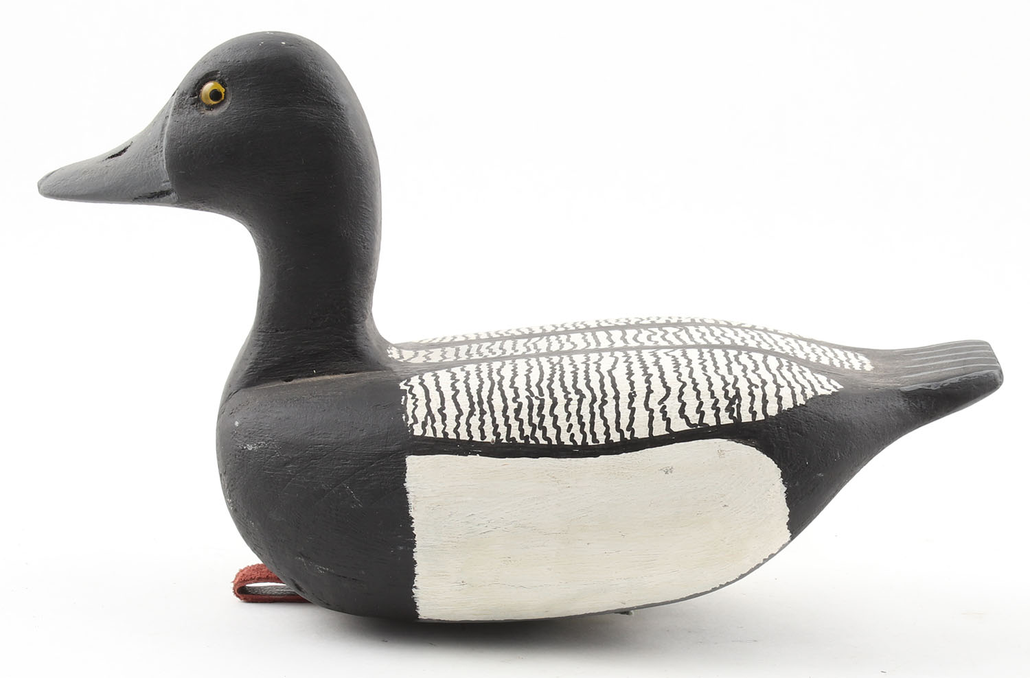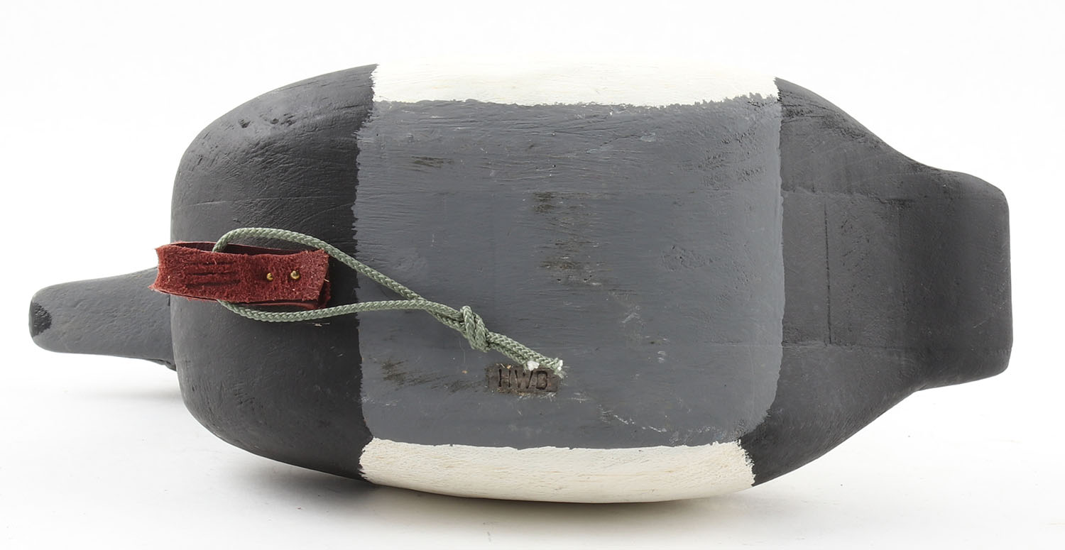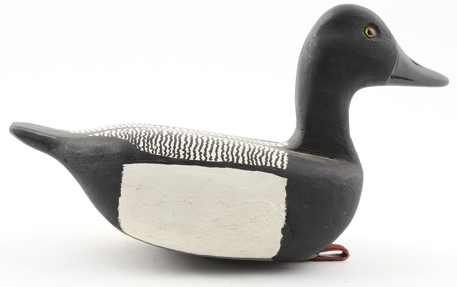 Bluebill Drake by HWB, glass eyes, hollow wood??, original paint, structurally excellent, 12'' OAL. Grade: Excellent - Value: 30 to 80