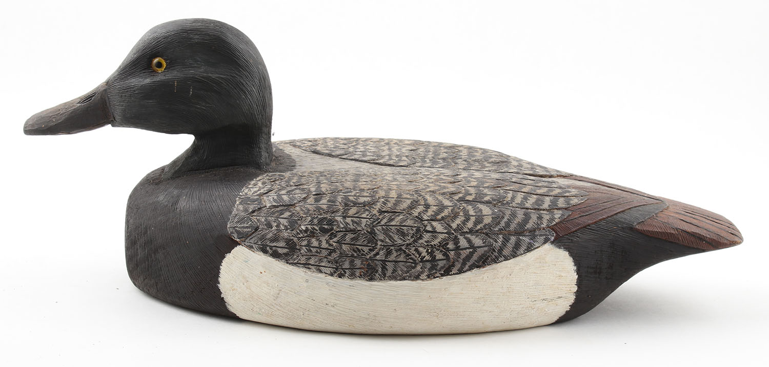 Bluebill Drake by E.W Fisher, 1978, glass eyes, solid wood, original paint, nice detail, structurally excellent, 16 1/2'' OAL. Grade: Excellent - Value: 40 to 80