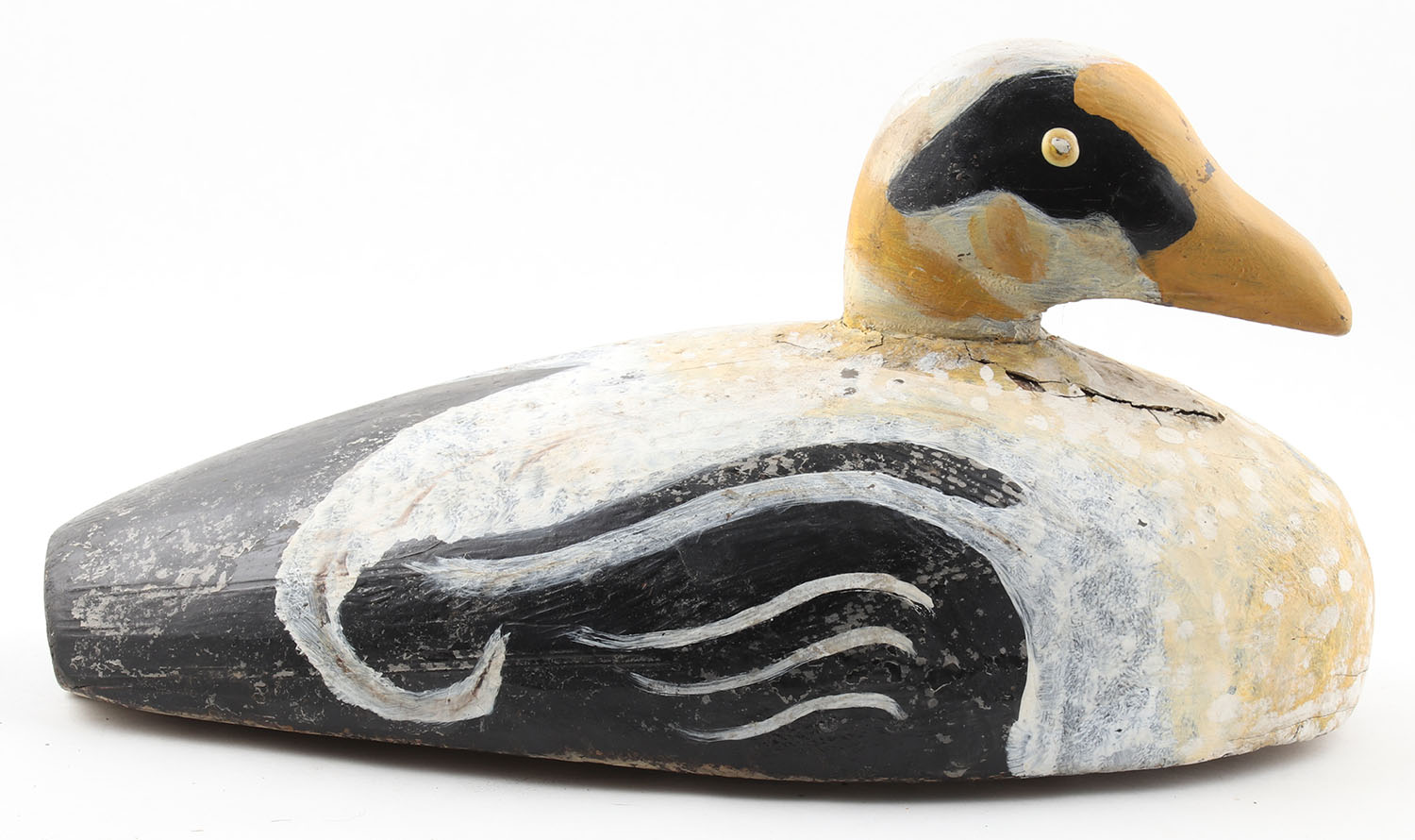 Eider by Unknown Maker, raised painted eyes, solid wood, original paint, cracking to paint around base of neck, wedge repair on bottom, 14'' OAL. Grade: Good - Value: 10 to 40