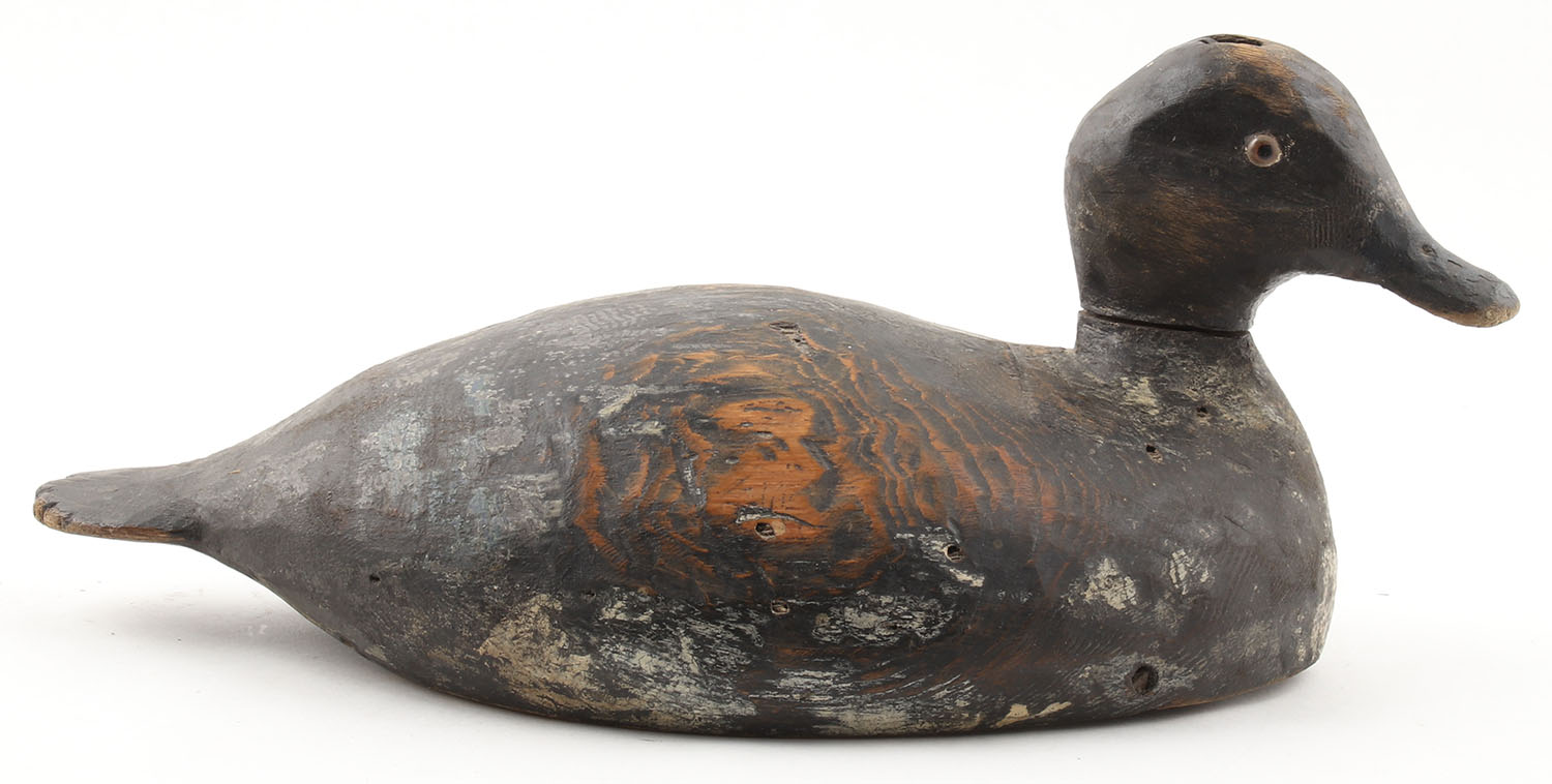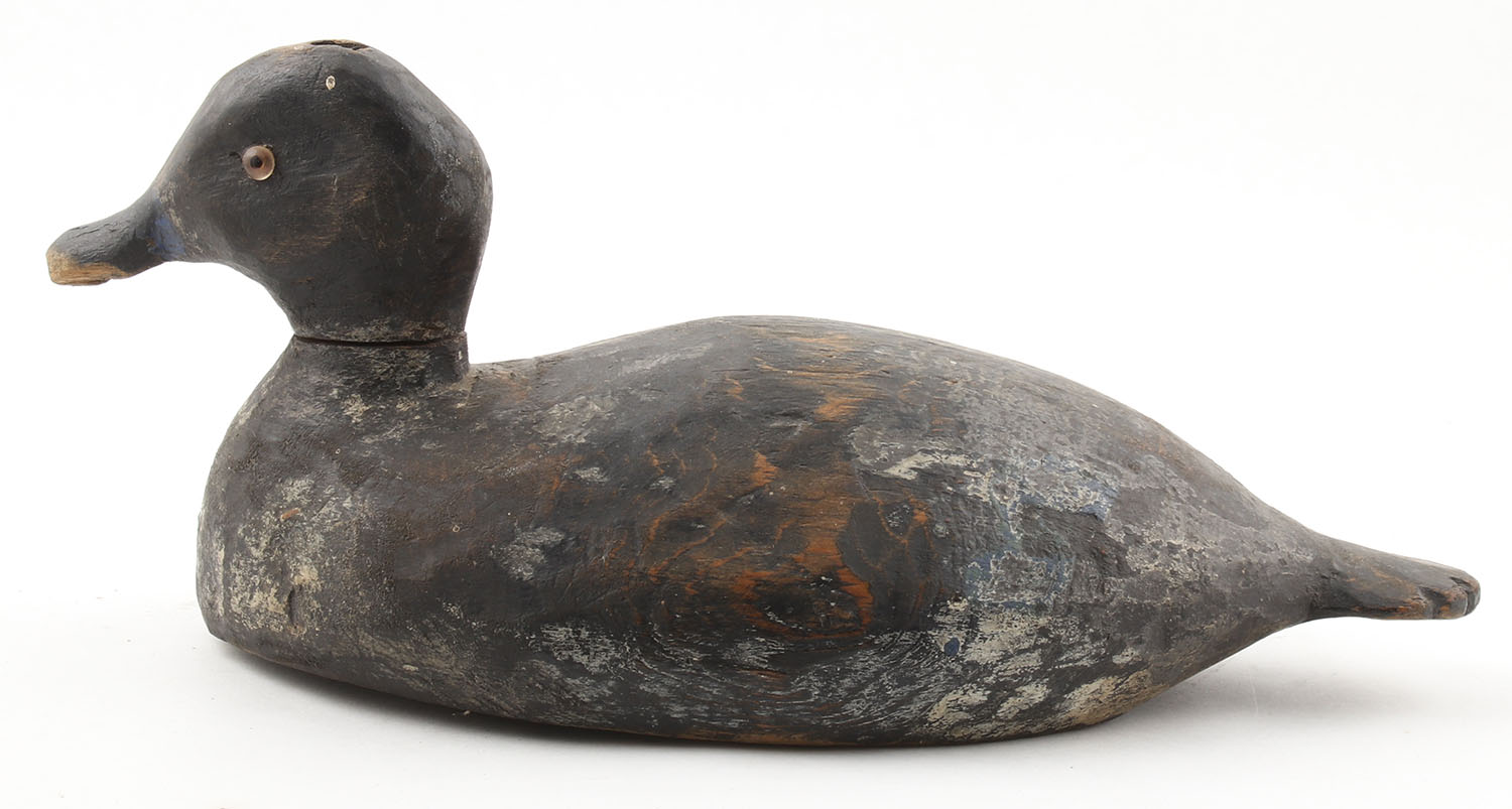 Bluebill Hen by N.C. MCA, glass eyes, solid wood, repaint, head & body separated, structurally sound, 13'' OAL. Grade: Good - Value: 10 to 50