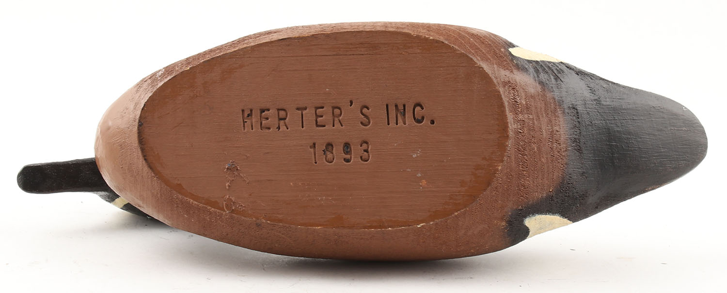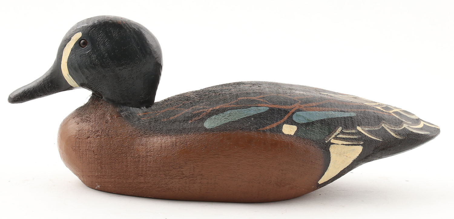 Bluewing Teal by Herter's Inc., Waseca, MN, 1893 Series, glass eyes, solid wood, original paint, structurally excellent, 12 1/2'' OAL. Grade: Excellent - Value: 40 to 120