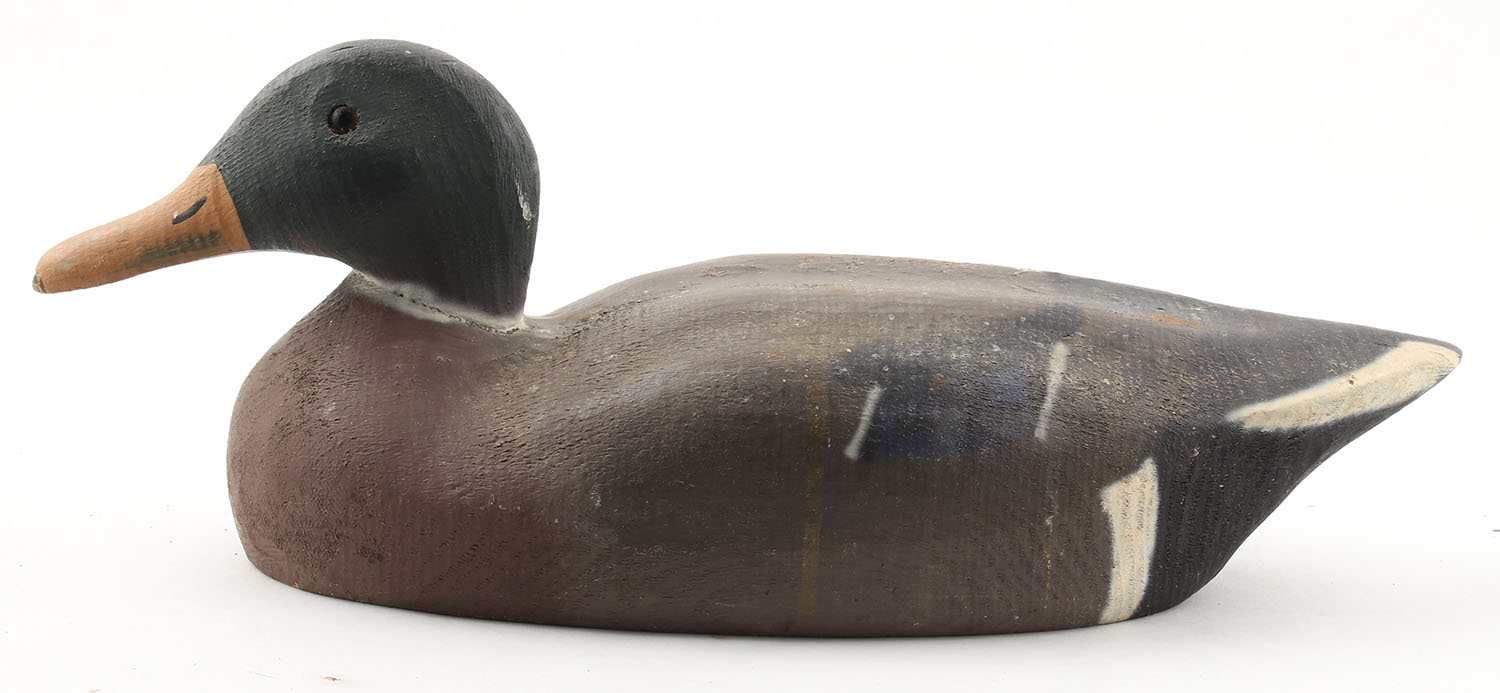 Mallard Drake by Herter's Inc, Waseca, MN, 1893 Series, glass eyes, solid wood, original paint, structurally excellent, stamped on bottom, 15'' OAL. Grade: Excellent - Value: 50 to 400