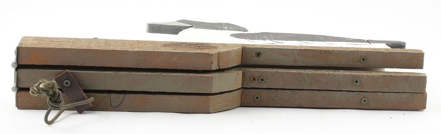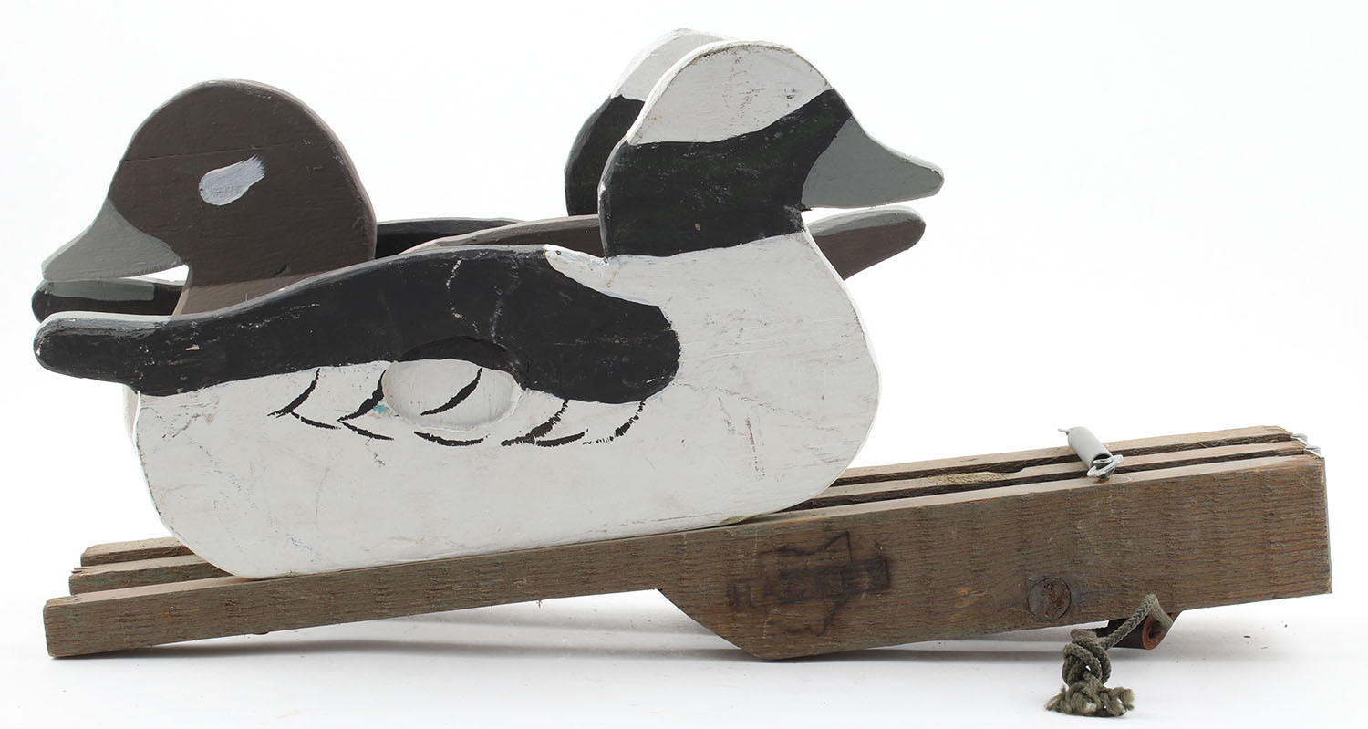 Tri-Folding Bluebill Decoys by Hackey, no eyes, all wood, original paint, marked on multiple surfaces, 18'' x 9'' OAL. Grade: Excellent - Value: 50 to 150