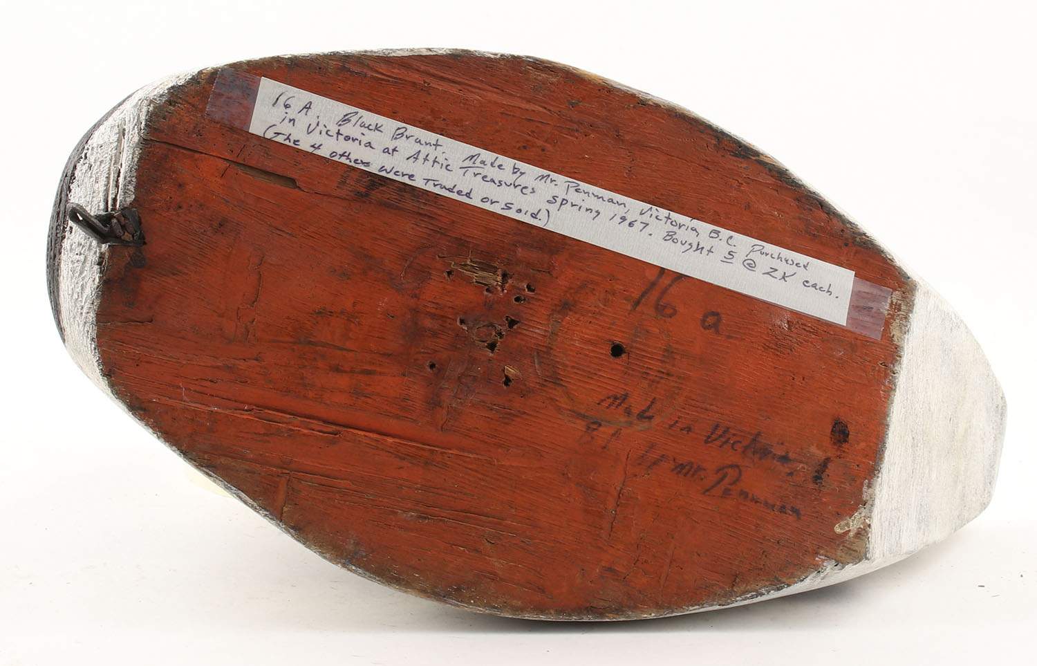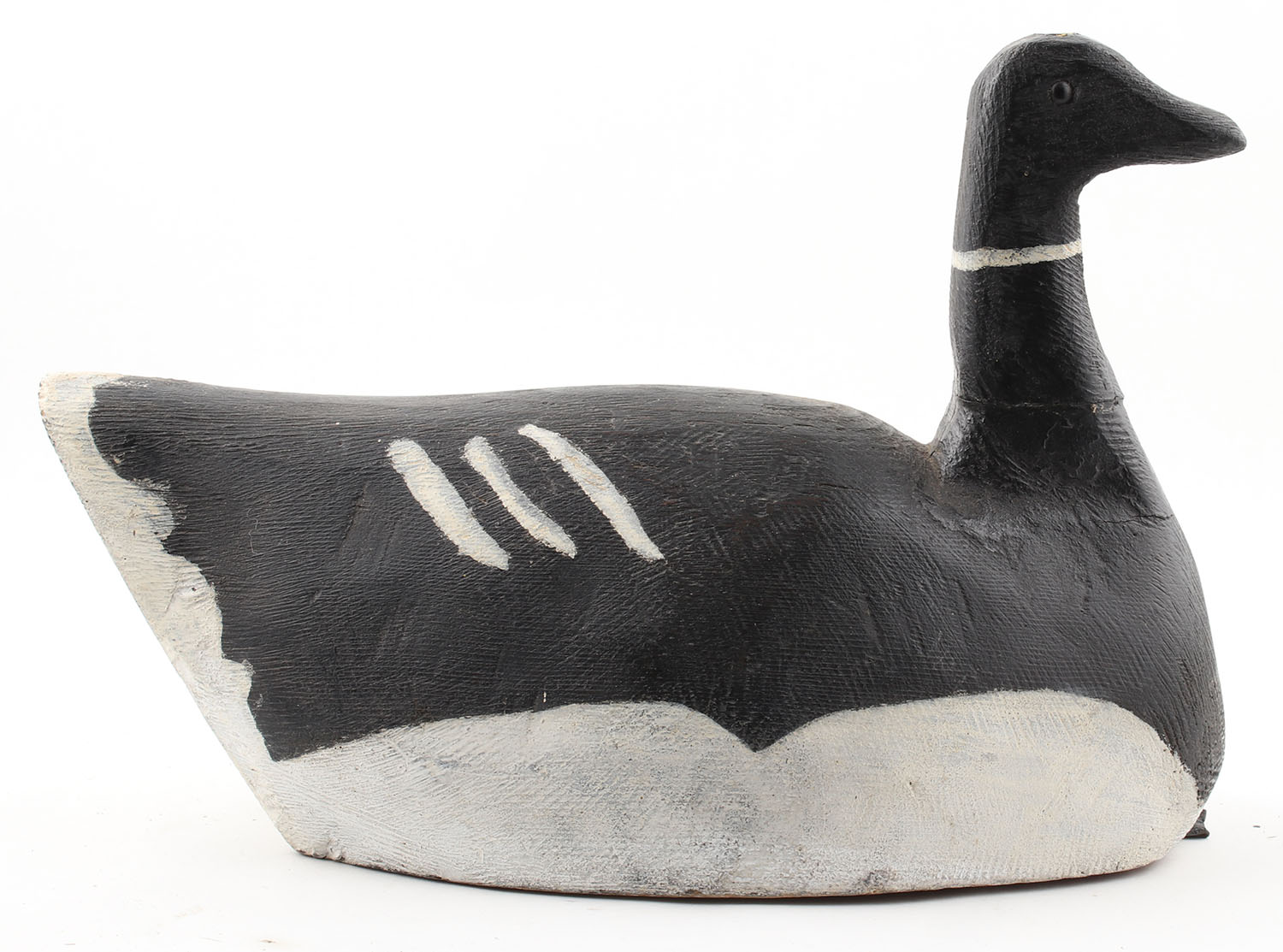 Black Brant by Penman, Victoria, B.C., circa 1960's, glass eyes, solid wood, original paint, repaired crack in neck, 16'' OAL. Grade: Very Good - Value: 50 to 250