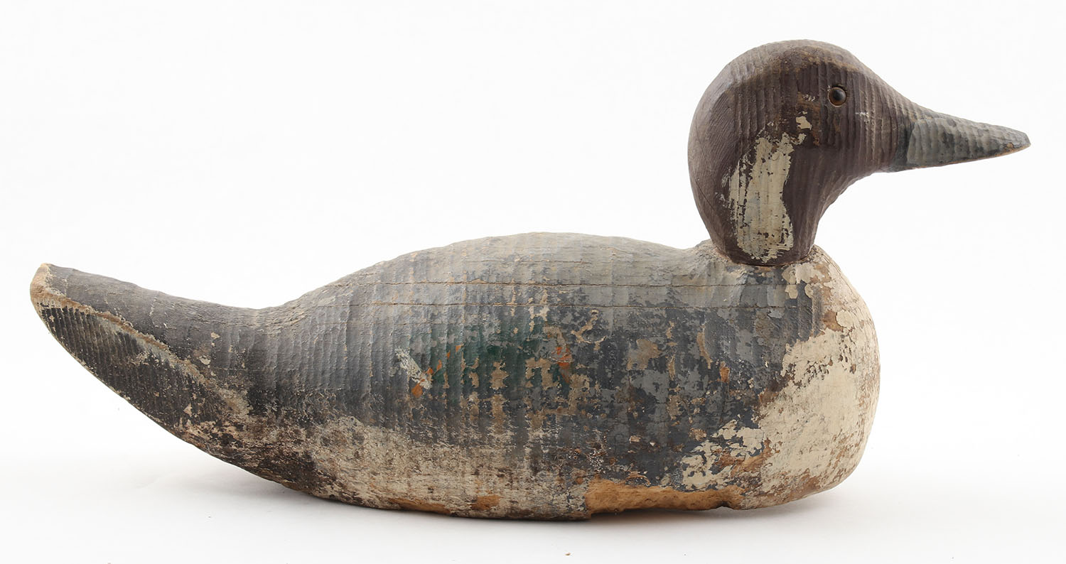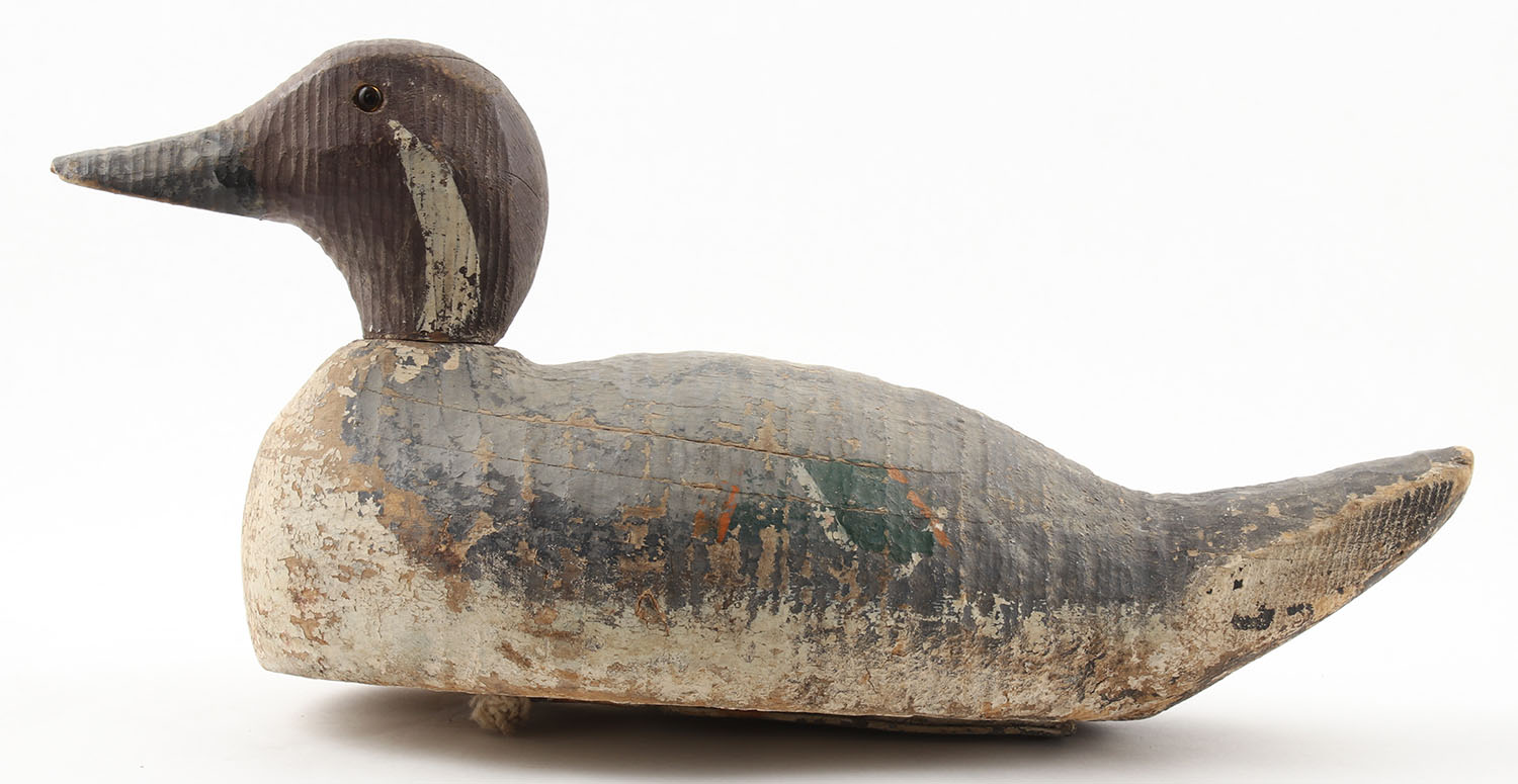 Pintail Drake by Unknown Maker, glass eyes, solid wood, original paint, structurally sound, 16'' OAL. Grade: Good + - Value: 20 to 60
