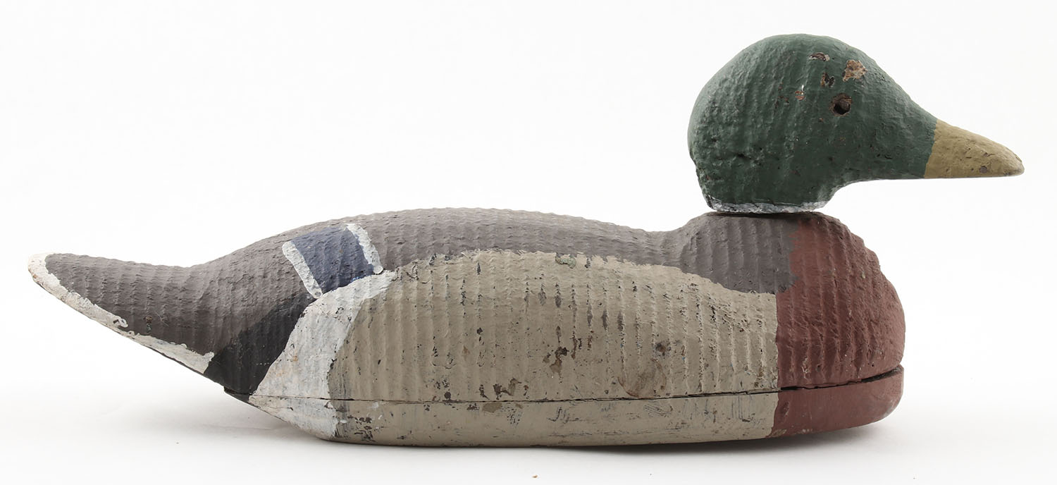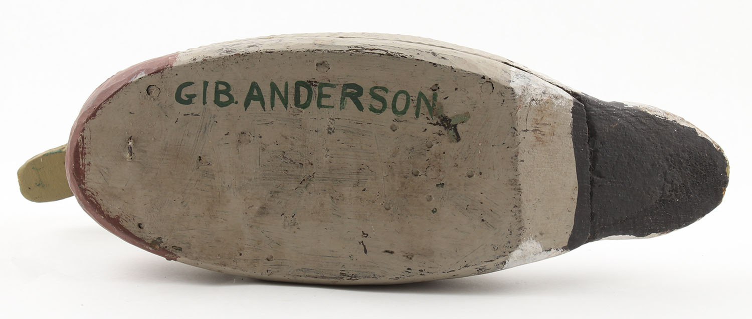 Mallard Drake by Gib Anderson, no eyes, solid lathed wood, original paint, structurally sound, head spins freely on dowel, 16'' OAL. Grade: Good ++ - Value: 20 to 40