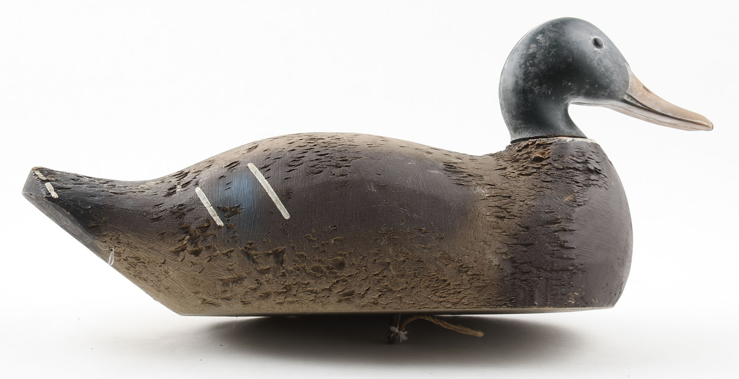 Mallard Drake by Animal Trap Co. Mississippi, raised painted eyes, solid wood body, original paint, plastic head, structurally excellent, marked on bottom, 15 1/2'' OAL. Grade: Very Good - Value: 20 to 40