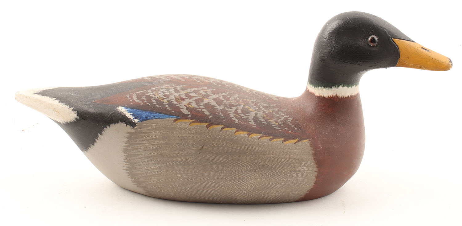 Miniature Mallard Drake by Betty Baldwin, 1986, glass eyes, sold wood, original paint, structurally excellent, signed on bottom, 10'' OAL - Value: 10 to 50