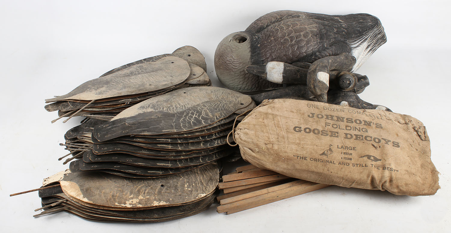 Large lot of Johnson goose decoys, comes with folding decoys with metal stakes, 3D decoys with heads & wood stakes. Grade: Very Good - Value: 10 to 100