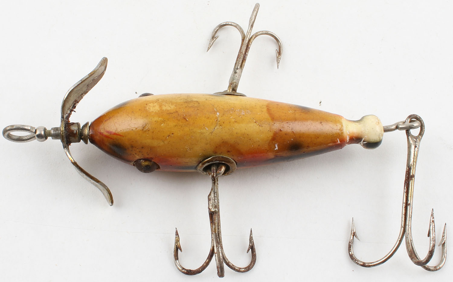 South Bend Crippled Minnow?, wood lure, GE, yellow/gold/red/black, 3 hooks, spinner, marked on spinner, 3 1/2'' OAL. Grade: Very Good++ - Value: 8 to 40