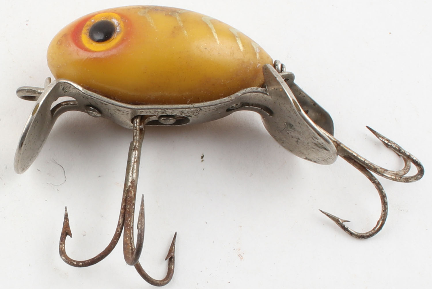 Fred Arbogast Hula Dancer, plastic lure, painted eyes, yellow with silver stripes, 2 hooks, dual fixed blade, marked on back, 2'' OAL. Grade: Very Good - Value: 4 to 20