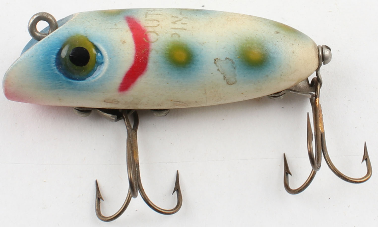 South Bend Spin-Oreno, No 967 WS, wood lure, PE, multi-color spotted pattern, two hooks, marked on back, 2'' OAL. Grade: Excellent - Value: 8 to 40