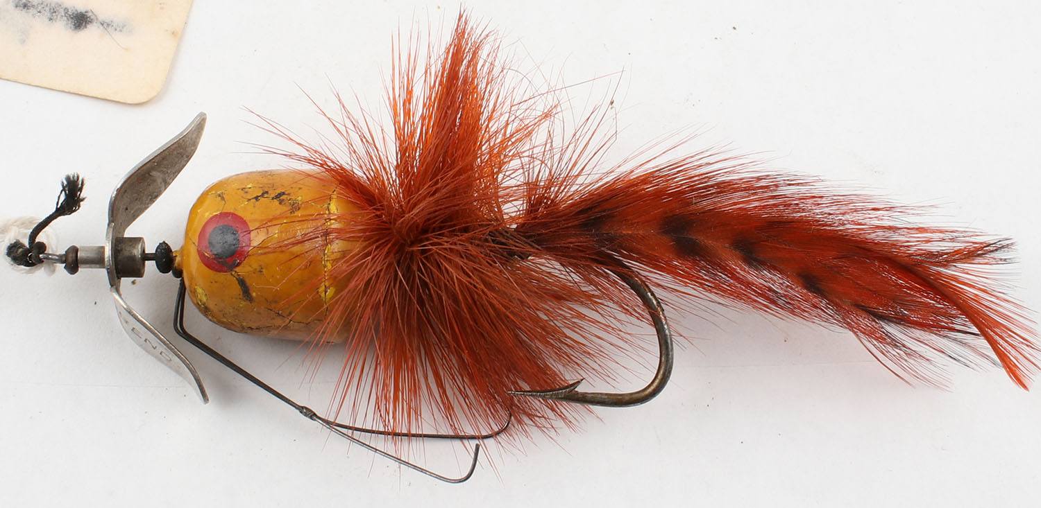 South Bend Strike-Oreno, wood lure, PE, yellow lure with red/black stripe feathers, single hook, marked on spinning blade, two prong weed guard, crazing, 4 1/2'' OAL. Grade: Very Good + - Value: 8 to 30