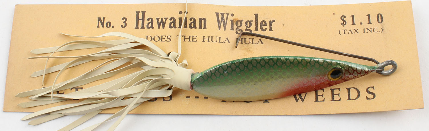 BOXED, Fred Arbogast, Hawaiian Wiggler No. 3, metal lure, PE, red/silver/green, single hook, weed guard, attached to original cardboard, rubber skirt excellent, 2 3/4'' OAL. Grade: Excellent - Value: 4 to 40