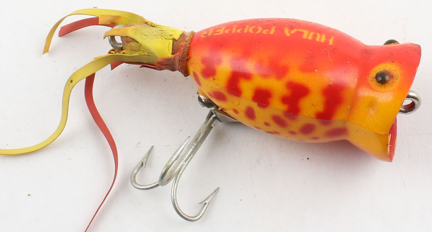 Fred Arbogast Hula Popper, TE, Fire Tiger pattern, single hook, marked on back, rubber skirt partially gone, 2'' OAL. Grade: Good - Value: 2 to 20