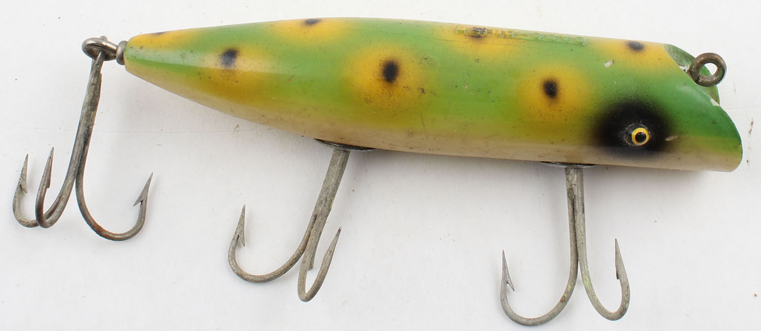 South Bend Bass-Obite, plastic lure, TE, frog pattern, 3 hooks (2 missing 1 prong), marked on back, 4'' OAL. Grade: Good ++ - Value: 8 to 40