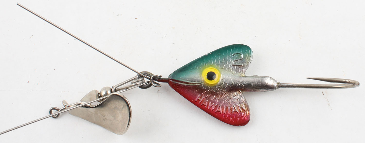 Fred Arbogast #2 Hawaiian, metal lure, PE, green/silver/red, single hook, spinning blade, weed guard, 3'' OAL. Grade: Excellent - Value: 2 to 20