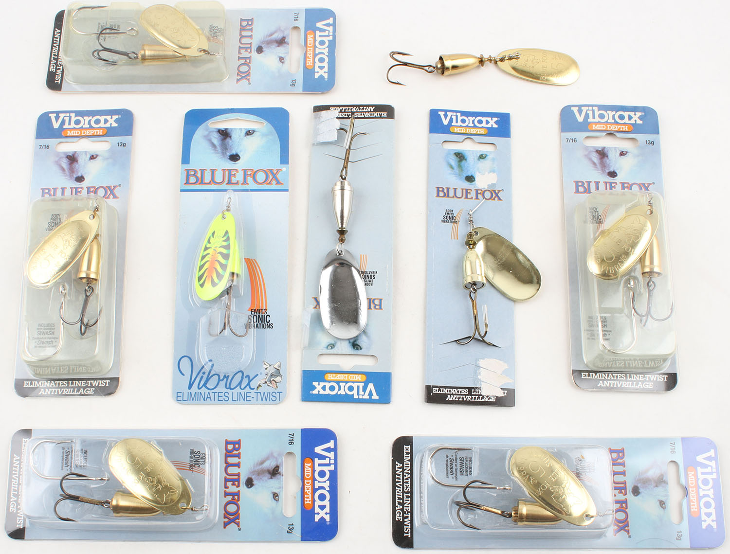 Lot of 9 Fishing Lures, 6 in unopened original packaging, 3 opened (2) still with the original packaging. Grade: Excellent + - Value: 20 to 60