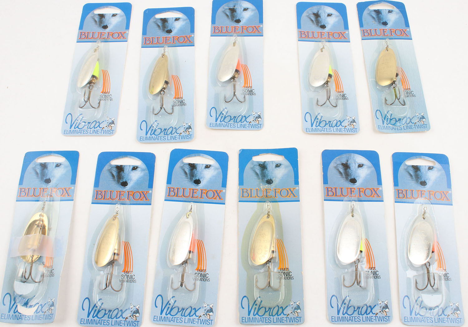 Lot of 11 Fishing Lures, 10 in unopened original packaging, 1 opened, with the original packaging. Grade: MINT - Value: 20 to 60