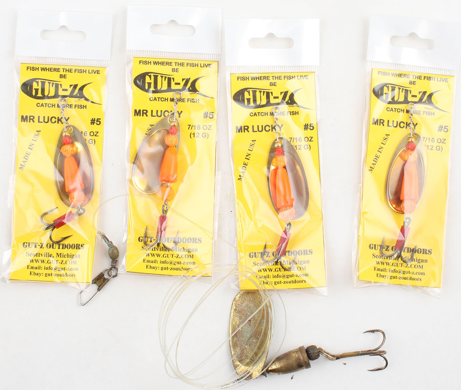 | Lot of 5 Fishing Lures, (4) Gut-z Spinners in original packaging...