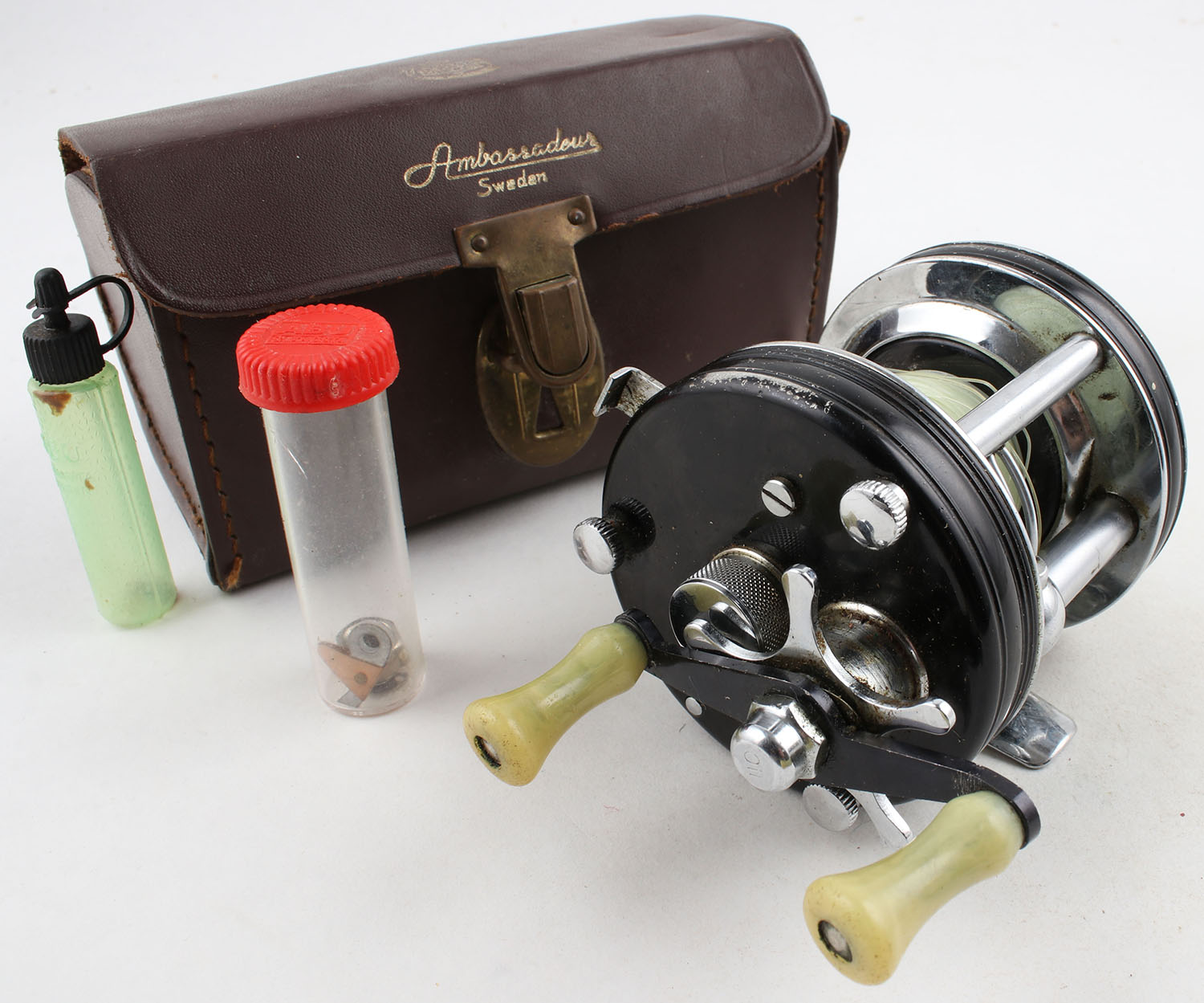 CASED, Abu Sweden, Ambassador 5000 C, no yardage mark, marked on side plate & reel seat, smooth turn, no audible clicks, comes in leather case, with extra parts & empty oil container. Grade: Excellent - Value: 20 to 100