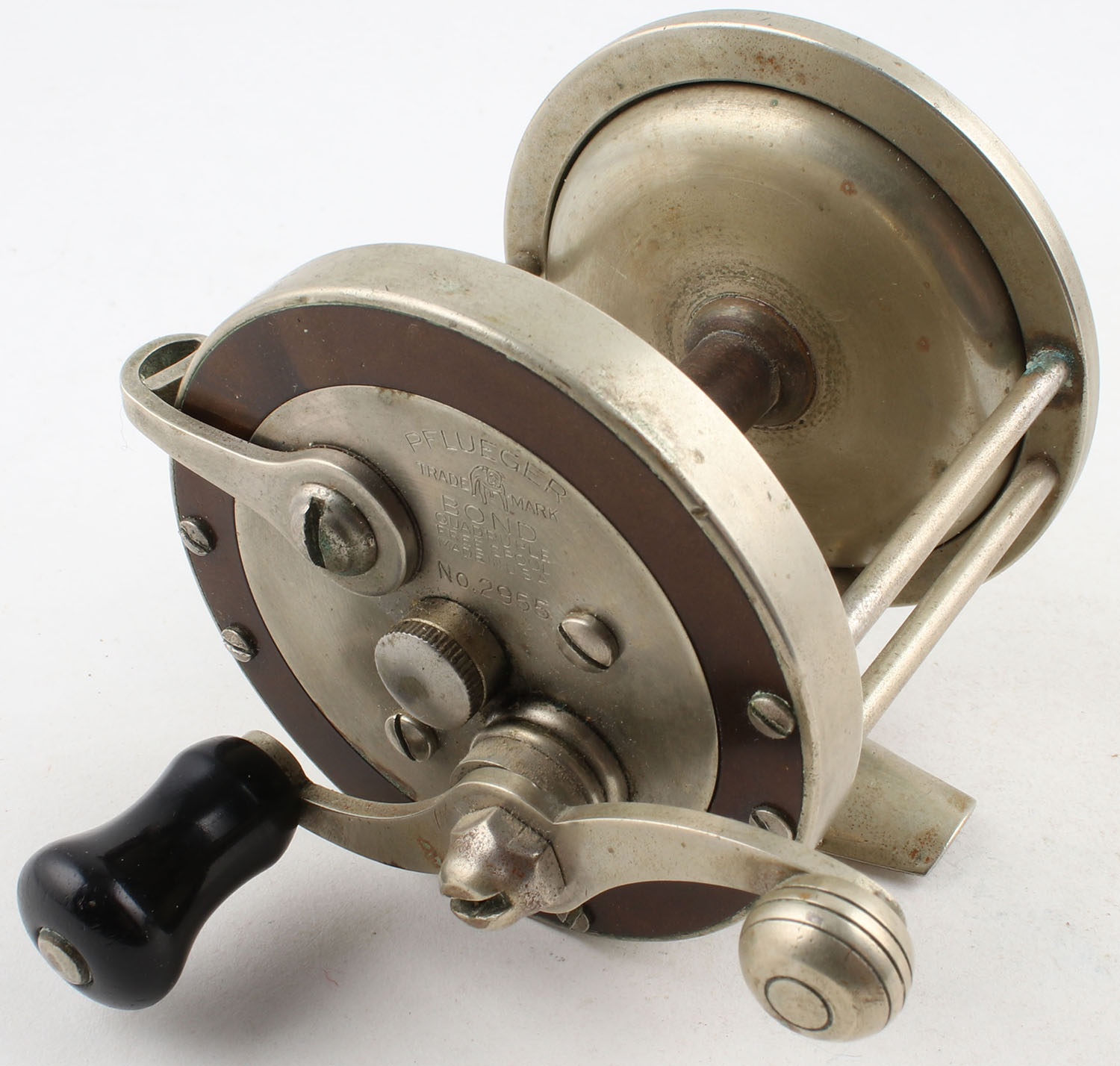 Pflueger Bond, No. 2955, bull dog logo, no yardage mark, single handle, marked on both side plates, smooth turn with some tension, very strong clicks. Grade: Excellent - Value: 10 to 50