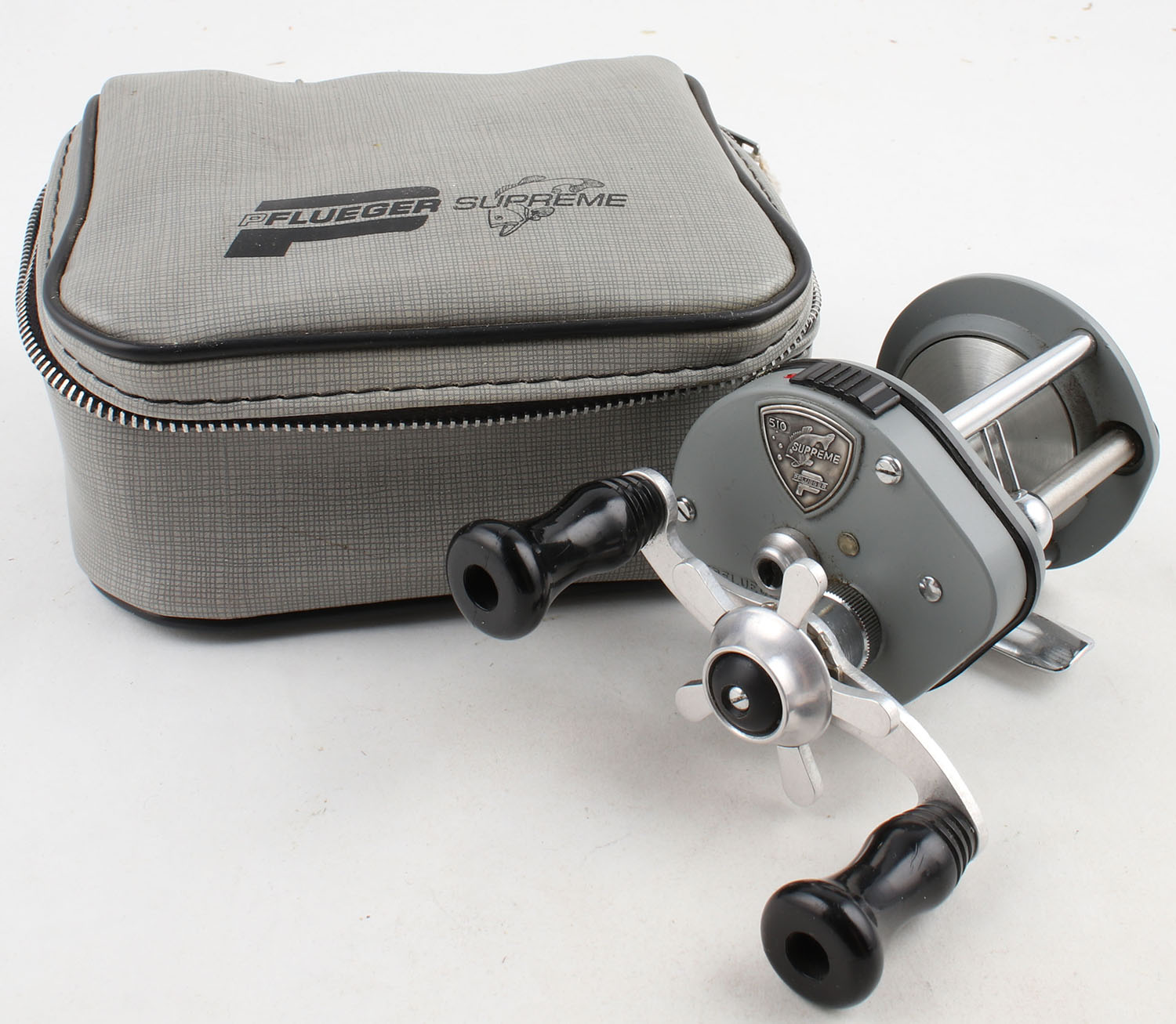 CASED, Pflueger Supreme 510, no yardage mark, dual handle, marked on side plate, smooth reel turn, some areas of tension, clear clicks, comes in Pflueger Supreme soft case, with tool, oil & rubber seals. Grade: Excellent - Value: 10 to 50