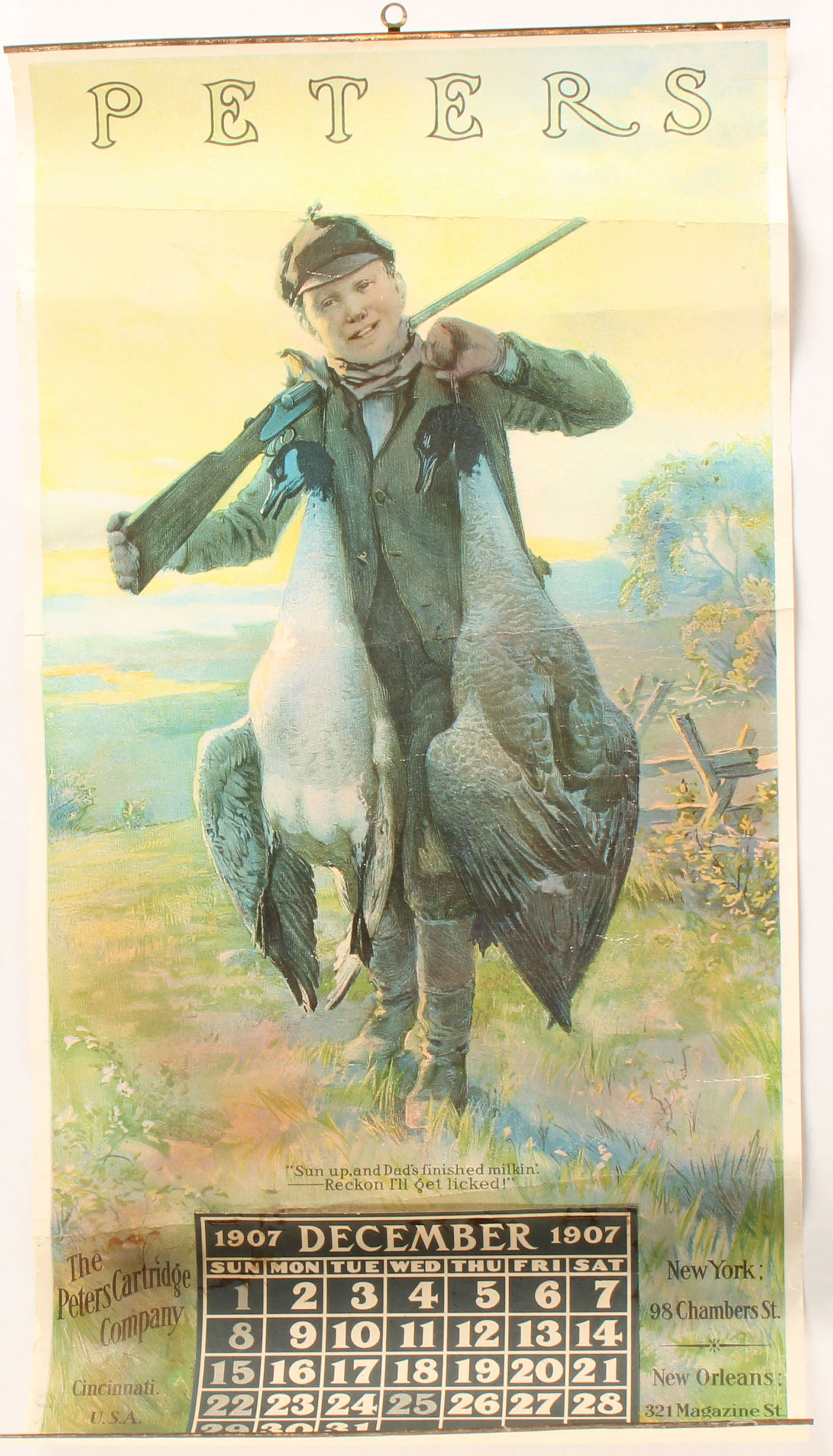 1907 Peters Cartridge Co. Calendar, ''SUN UP, AND DAD'S FINISHED MILKIN, RECON I'LL GET LICKED'', pictures a young hunter with a double barrel shotgun & two geese strung around his neck, standing in a grass field with horizon backdrop, top & bottom brass bands & brass hanger, December calendar page only, (3) full length creases from side to side, with additional light creases from rolling & tube storage, image colors are faded, some rust to bands, still a nice example of a very hard to find calendar, 14'' x 28''. Grade: Good++ - Value: 2000 to 6000